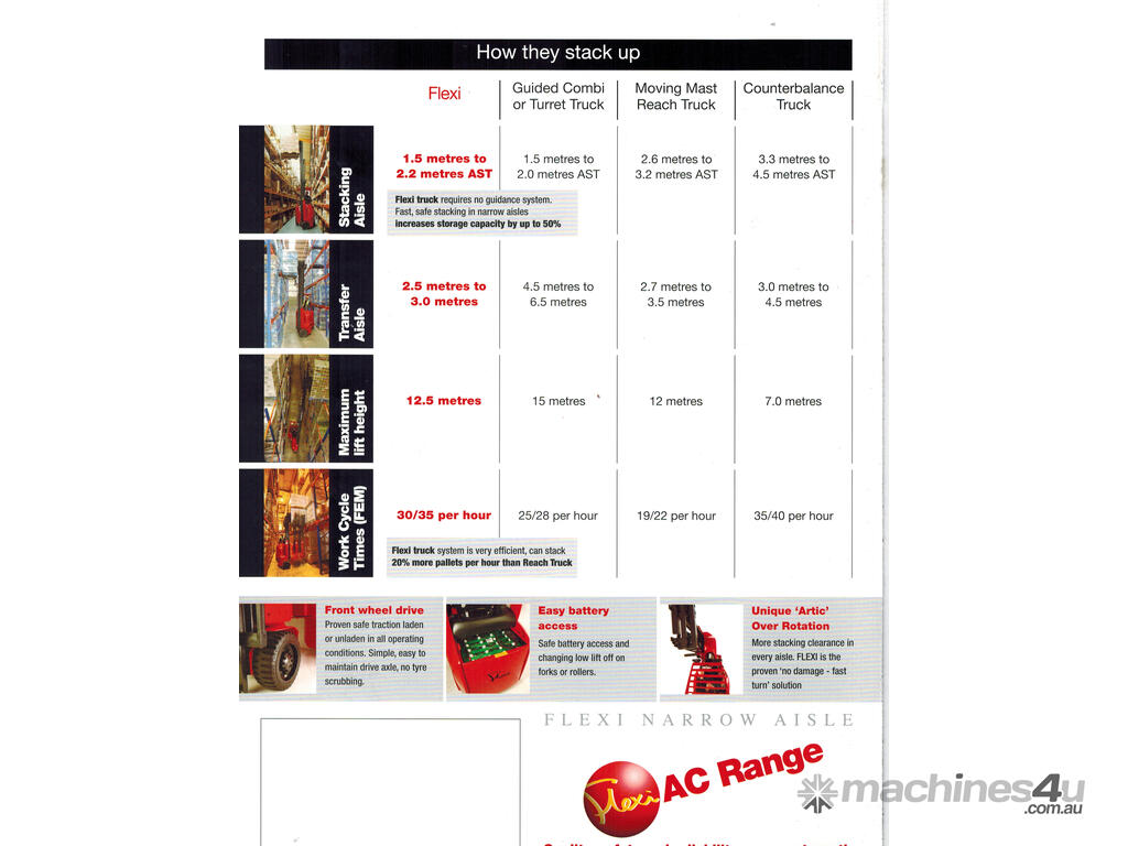 FlexiLift Australia has a comprehensive refurbishment program for the Flexi Narrow Isle Articulated Forklift. In Order to keep up with demand of these highly sort after forklifts we offer to repurchase or trade in all used Flexi Narrow Isle forklifts we are able to locate.